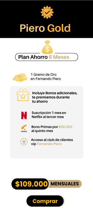 Con nuestro plan Gramo a Gramo, puedes adquirir tus joyas de oro ahorrando poco a poco desde $30.000 mensuales. Es un ahorro pensado para ti, que valoras la elegancia, el oro y la libertad de pagar a tu ritmo.